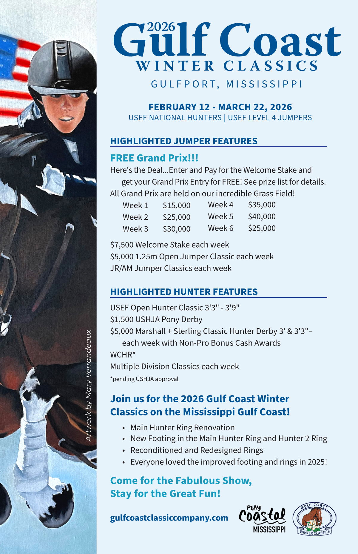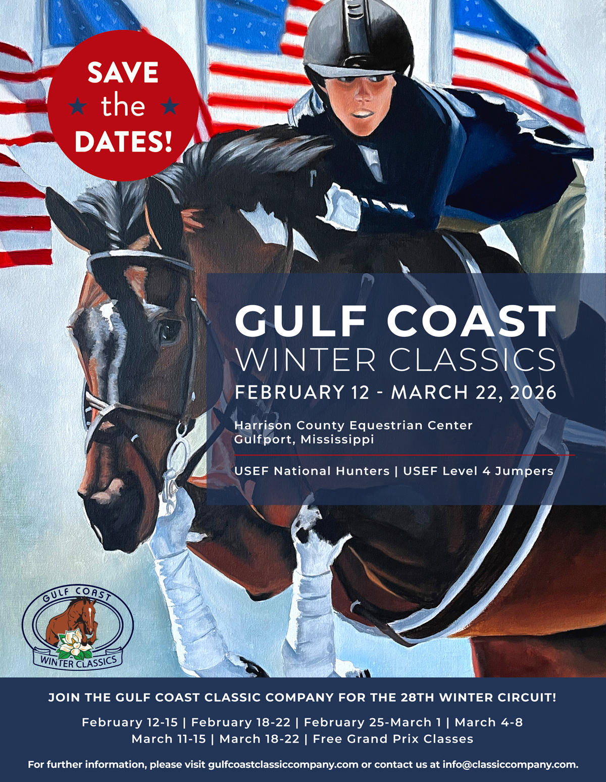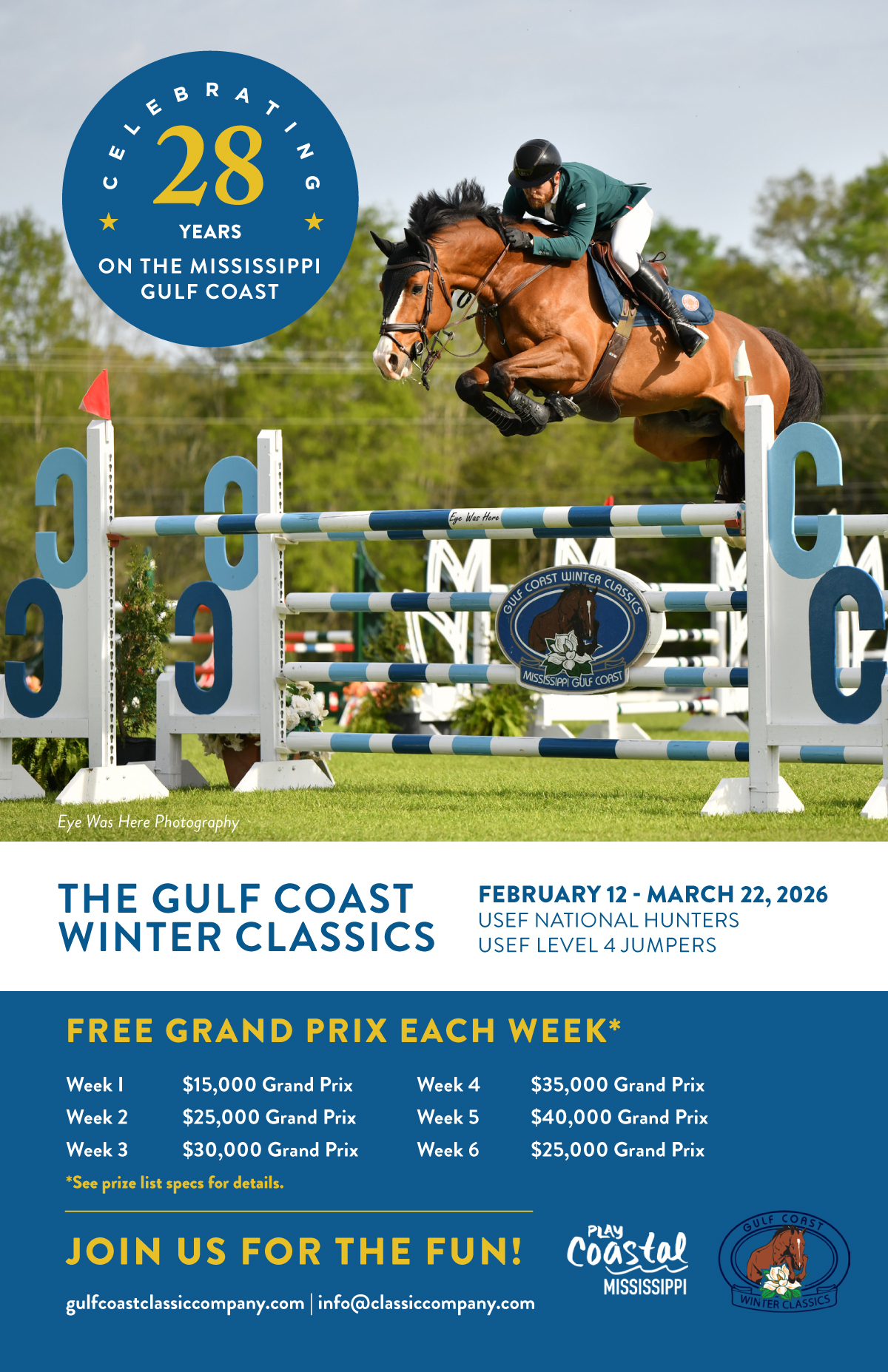 Gulf Coast Winter Classics is an award winning six week winter Hunter / Jumper series in Gulfport, MS at the Harrison County Fairgrounds. Competitors range from Leadline to Grand Prix. Come enjoy southern hospitality and the Mississippi Gulf Coast. Official Show Photographer Dave Butterworth, EyeWasHere.net. Official Gulf Carts, the Golf Cart Guy (919) 465-3227.